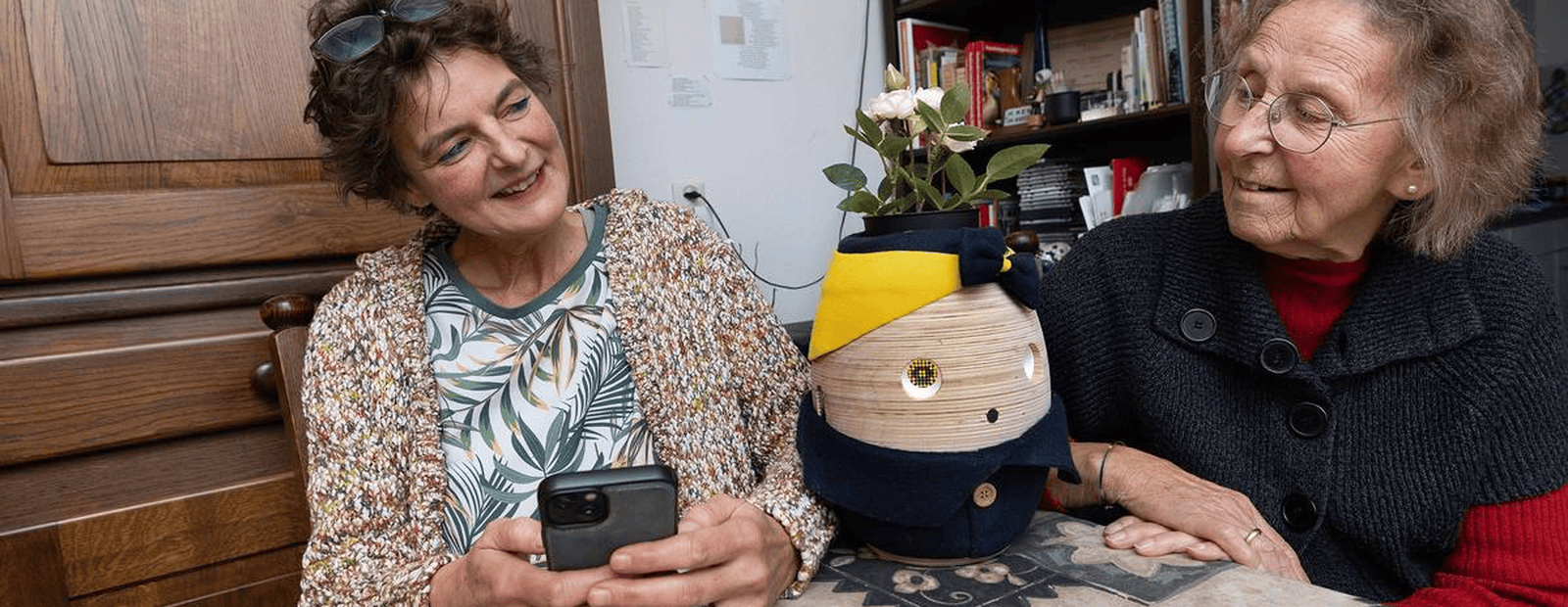 Een jaar geleden werd Tessa als proef bij Loes thuis geplaatst. Tessa werd geprogrammeerd om Loes elk uur eraan te herinneren en te motiveren een glas water te drinken. Loes raakte aan Tessa gewend. Sterker nog, inmiddels hoort ze er bij.